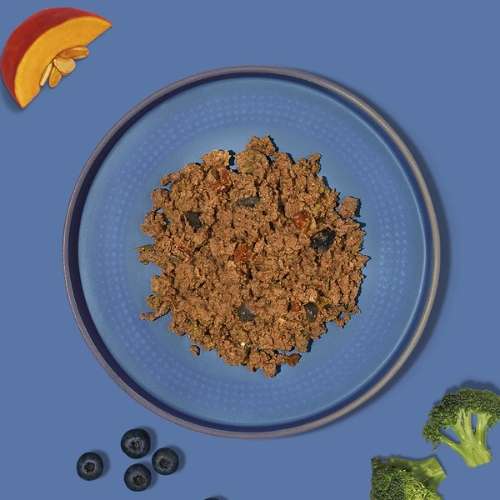 Vers lamsvlees, wortelen, bosbessen, lijnzaad (natuurlijke bron van omega 3 vetzuren), laurier, schors, kurkuma, mineralen, glucosamine, chondroïtine, vitamine A, D en E.