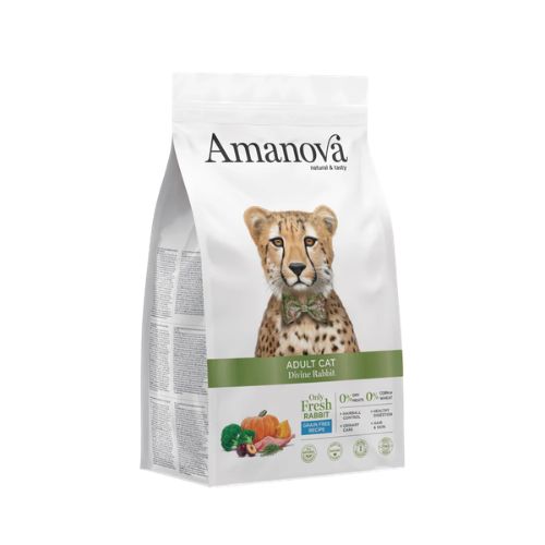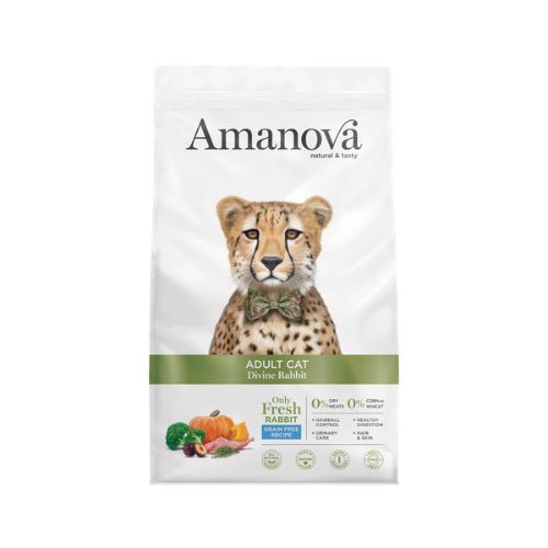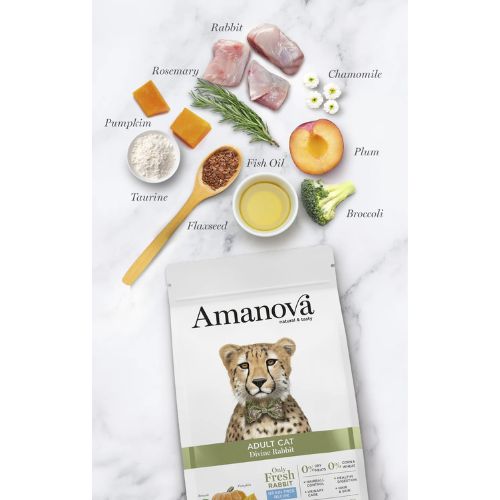 Amanova Adult Cat Divine Rabbit is een complete, graanvrije voeding voor volwassen katten vanaf 12 maanden. Deze brok wordt bereid met uitsluitend vers konijn als enige dierlijke eiwitbron en bevat geen vleesmeel of gedehydrateerd vlees.