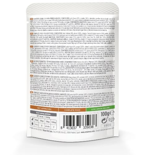 Verse kip (65%), pruimen (2,6%), mineralen, lijnzaad (natuurlijke bron van omega 3 vetzuren) (0,03%), glucosamine (300 mg/kg), inuline (bron van FOS) (0,22%), gehydrolyseerde celwand van gisten (bron van MOS) (0,22%), chondroïtine (217 mg/kg), quinoa (100 mg/kg), kurkuma, rozemarijn (100 mg/kg), calendula.