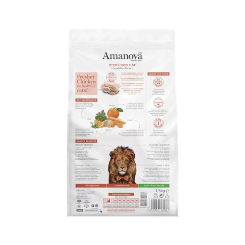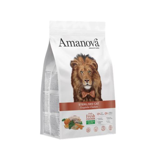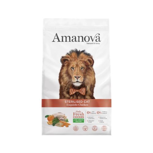 Amanova Sterilised Exquisite Chicken is een premium kattenvoeding voor gesteriliseerde katten vanaf 12 maanden. Deze voeding wordt bereid met uitsluitend vers kippenvlees als enige dierlijke eiwitbron en bevat geen vleesmeel of gedehydrateerd vlees.