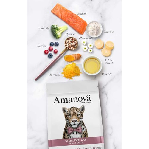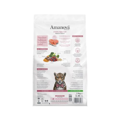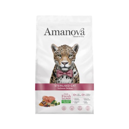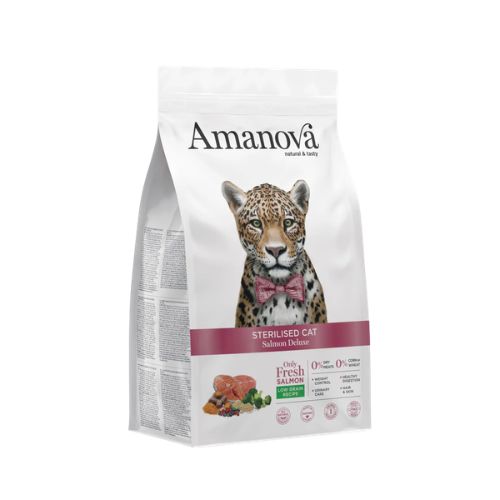 Amanova Sterilised Salmon Deluxe is een hoogwaardige kattenvoeding voor gesteriliseerde katten vanaf 12 maanden. De voeding wordt bereid met uitsluitend vers bereide zalm als enige dierlijke eiwitbron en bevat geen vleesmeel of gedehydrateerd vlees.