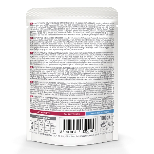 Verse kalkoen (64%), bosbessen (2,6%), pompoen (2%), mineralen, lijnzaad (natuurlijke bron van omega 3 vetzuren) (0,03%), glucosamine (300 mg/kg), inuline (bron van FOS) (0,02%), gehydrolyseerde celwand van gisten (bron van MOS) (0,02%), chondroïtine (215 mg/kg), broccoli (100 mg/kg), gember (100 mg/kg), kruidnagel (100 mg/kg).