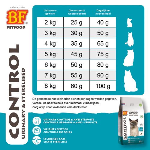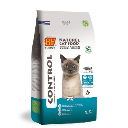 BF Petfood Control Urinary Sterilised is een hoogwaardige, volledige en natuurlijke kattenvoeding die speciaal ontwikkeld is voor volwassen katten met gevoeligheid voor struvietblaasgruis of struvietstenen en voor katten met overgewicht, bijvoorbeeld na sterilisatie of castratie.