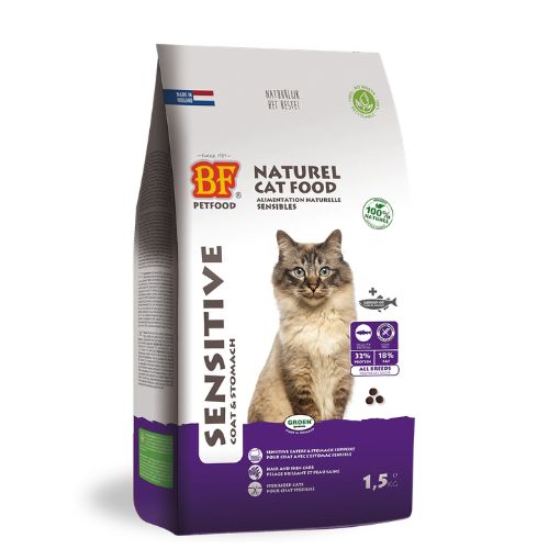 BF Petfood Sensitive Coat Stomach is een hoogwaardige, volledige en natuurlijke premium kattenvoeding voor voedingsgevoelige en kieskeurige katten. De graanvrije en hypoallergene receptuur is geschikt voor zowel jonge als volwassen katten.