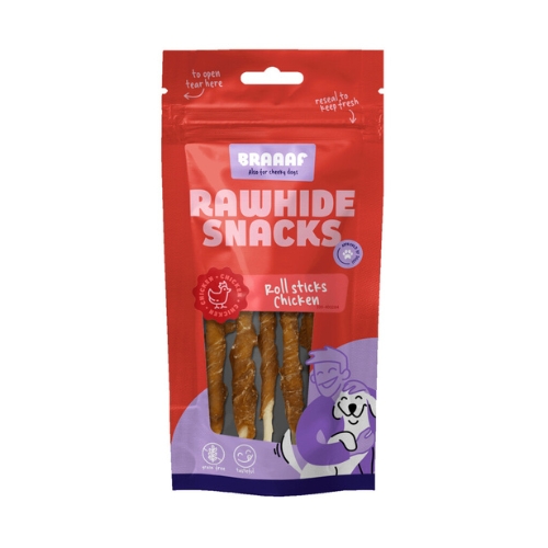 Braaaf Rollsticks Chicken zijn smaakvolle rawhide kauwsticks van stevige buffelhuid, rijkelijk omhuld met mals kippenvlees. De combinatie van stevige kauwstructuur en natuurlijke kipsmaak maakt deze snack onweerstaanbaar voor vrijwel iedere hond. Met een lengte van 12 cm zijn de sticks ideaal voor honden die graag langer kauwen.