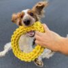 De katoenen vezels van deze flosring dragen bij aan een gezonde mondhygiëne doordat ze tijdens het kauwen langs de tanden wrijven en zo tandplak helpen verminderen. De melange gele kleur geeft het speeltje een vrolijke en moderne uitstraling die meteen opvalt in de speelgoedmand. Of je nu kiest voor een apporteerspel in de tuin of een stevig trekspel binnenshuis, deze ring ligt comfortabel in de hand en is makkelijk weg te gooien. Het stevige karakter van het touw zorgt bovendien voor langdurig speelplezier en voldoende kauwweerstand.