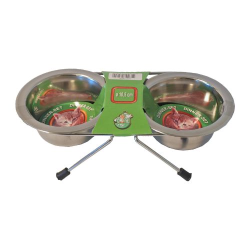 De Dinnerset met 2 RVS Bakken is een praktische en hygiënische oplossing voor het voeren van honden en katten. De set bestaat uit twee roestvrijstalen bakken in een stevige draadstandaard.