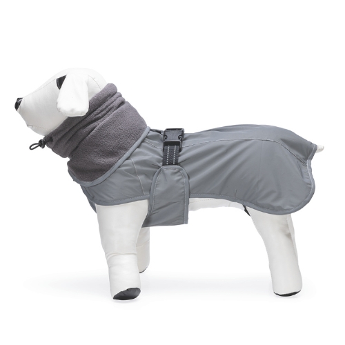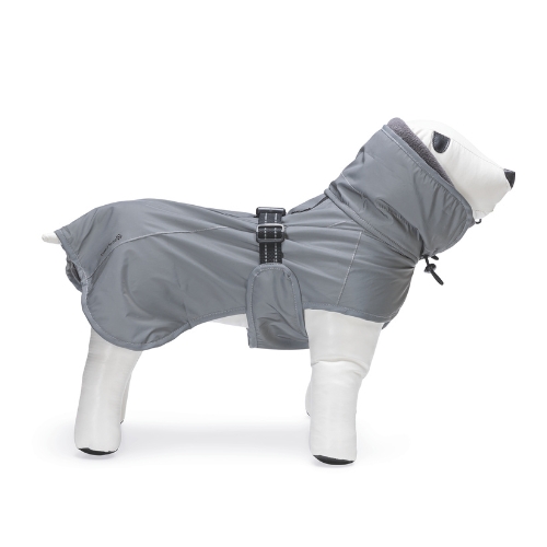 De binnenzijde is gevoerd met zachte fleece die warmte vasthoudt, zodat jouw hond het ook bij lagere temperaturen comfortabel heeft. Het nekstuk is voorzien van elastische koordjes waarmee je de pasvorm eenvoudig kunt aanpassen. Hierdoor sluit de jas goed aan en blijft warmte beter behouden. De jas is snel en gemakkelijk aan te trekken dankzij de verstelbare buikband die je vastklikt op de rug. Bovenop bevindt zich een waterdichte ritssluiting waarmee je eenvoudig een lijn kunt bevestigen aan een halsband of tuig.
