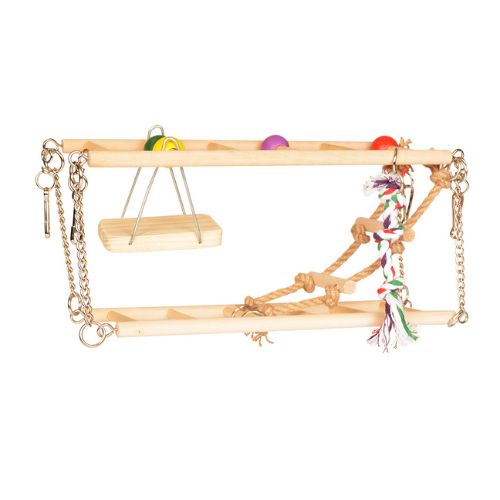 De brug bestaat uit twee stevige houten ladders waartussen verschillende speelelementen hangen. Zo is er een touwladder om in te klimmen, een katoenen speeltouw om aan te knagen en mee te spelen, en een houten schommel die zorgt voor extra uitdaging en beweging. Dit zorgt voor afwisseling in het verblijf en voorkomt verveling.