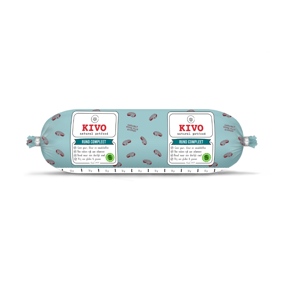 Rund Compleet is gemaakt van de sappigste rundertrimmings, dat is runderspiervlees. Bij KIVO worden er geen dieren geslacht voor dieren, de afsnijdsels van de biefstukken (trimmings) die overblijven die zijn hartstikke goed! En daar wordt dan weer het lekkerste hondenvoer van gemaakt. Daarnaast bevat het ook een percentage orgaan & bot want die heeft je hond nodig voor de vitaminen en mineralen. Omdat deze uit de vleesingrediënten komen zijn ze beter opneembaar en hebben ze een hogere biologische waarde.