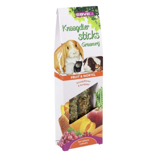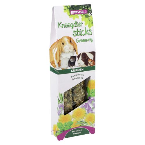 ESVE Knaagdiersticks Graanvrij zijn gezonde en smaakvolle snacks, volledig afgestemd op de voedingsbehoefte van konijnen en knaagdieren. Deze sticks bevatten zorgvuldig geselecteerde grondstoffen die van nature graag gegeten worden.