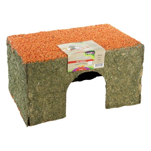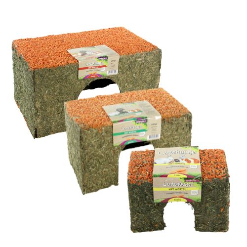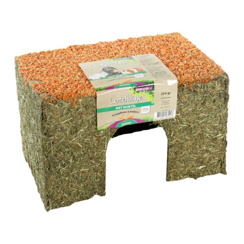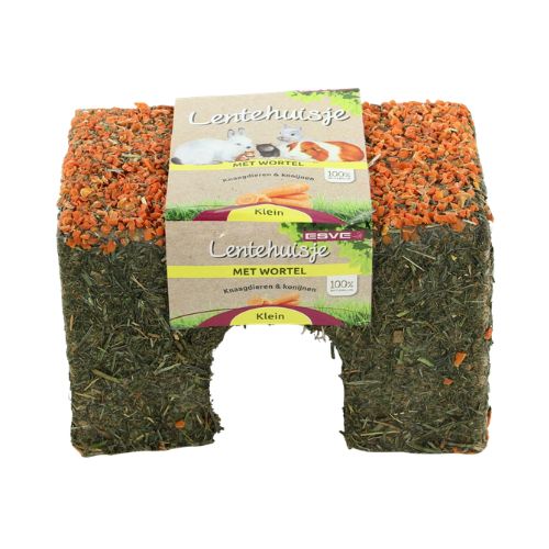 Het ESVE Lentehuis Wortel is een combinatie van schuilplek en aanvullend voer voor knaagdieren en konijnen. Dit natuurlijke huisje biedt volop mogelijkheden om te slapen, knabbelen, verstoppen, klimmen en knagen.