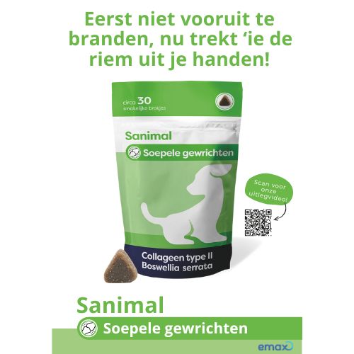 Sanimal Soepele Gewrichten helpt bij en voorkomt gewrichtsproblemen. Bij gewrichtsproblemen verdwijnt kraakbeen in het gewricht sneller dan het aangemaakt kan worden door het lichaam. Hierdoor ontstaat slijtage en zal de hond stijver worden en nog minder gaan bewegen. Het product heeft dezelfde samenstelling als Flexadin Advanced wat verkrijgbaar is bij de dierenarts, er is zelfs nog omega 6 aan toegevoegd.
