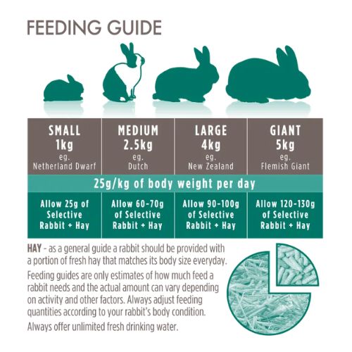 Een volwassen konijn van ongeveer 2,5 kg heeft gemiddeld 60 tot 70 gram per dag nodig. Zorg altijd voor onbeperkt vers hooi, verse groenten en schoon drinkwater. Bewaar de voeding op een koele, droge plaats.