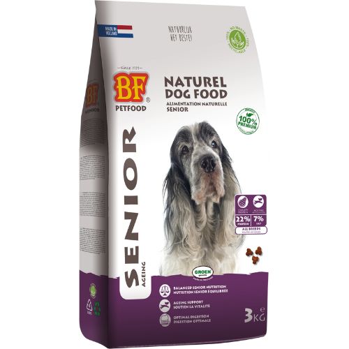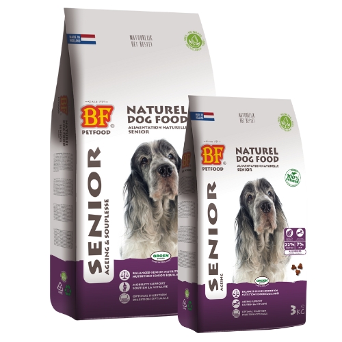 BIOFOOD Senior is een volledige licht verteerbare, natuurlijke en zeer smaakvolle hondenvoeding speciaal ontwikkeld voor de oudere hond. 47% rund, gevogelte, wild zwijn en rijst. Met zalmolie, glucosamine, chondroïtine en echinacea kruiden. Hoge acceptatie en verteerbaarheid. Gereduceerd energie-, eiwit-, vet- en mineralengehalte. Ondersteunt mobiliteit en gewrichten. Vitamine E en selenium, een antioxidantcomplex, beschermt tegen celveroudering. Zonder chemische toevoegingen. Optimale voeding die zorgt voor een betere vertering, ontlasting en een goede conditie van uw hond. Voor alle hondenrassen.