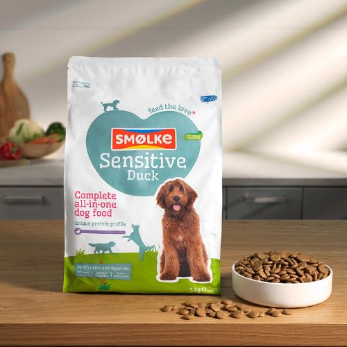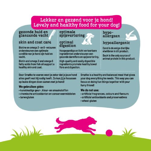 Smølke Sensitive Duck is een complete en uitgebalanceerde hondenvoeding voor honden met een gevoelige spijsvertering of huid en vachtproblemen. Dankzij het gebruik van één dierlijke eiwitbron wordt de kans op overgevoeligheidsreacties verkleind.