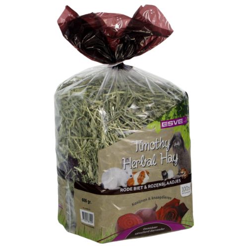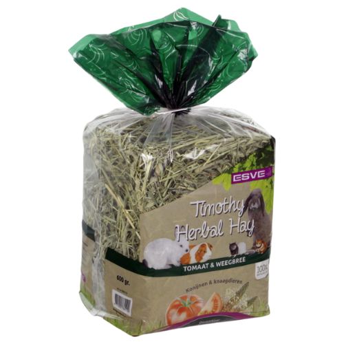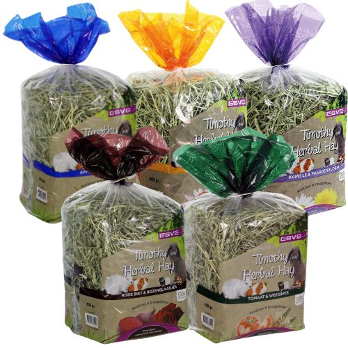 Timothy Herbal Hay van ESVE is een hoogwaardige grassoort afkomstig uit het zonnige Midden Canada. Dankzij het landklimaat en de warmte van de zon is dit hooi extra groen, smakelijk en rijk aan voedingsvezels. De vezels, vooral in de stengels, ondersteunen een gezonde spijsvertering en dragen bij aan een stabiele darmflora. De natuurlijke calcium fosfor verhouding helpt bij het behoud van sterke botten en tanden.