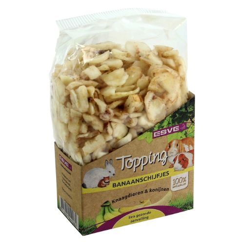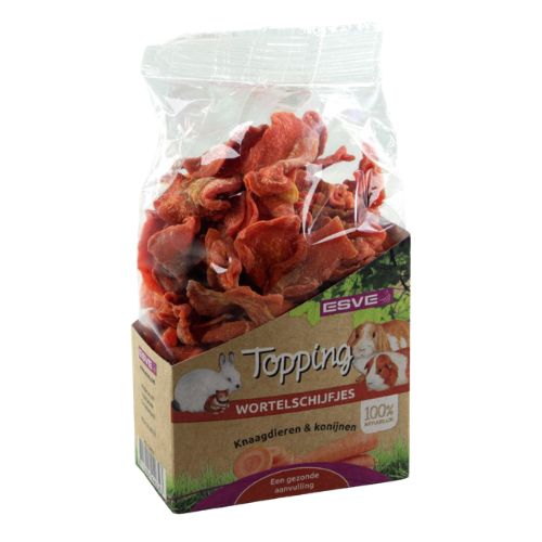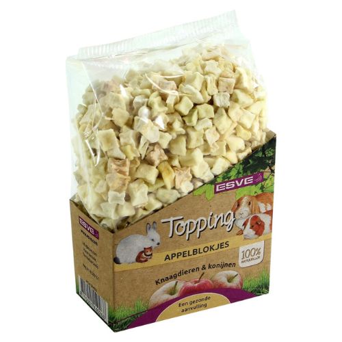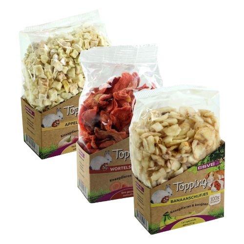 ESVE Topping is een smakelijke en natuurlijke aanvulling op de dagelijkse voeding van konijnen en knaagdieren. De toppings bestaan uit puur gedroogde fruit- of groentesoorten zonder toevoegingen en zijn ideaal als beloning of om door het voer of hooi te mengen.