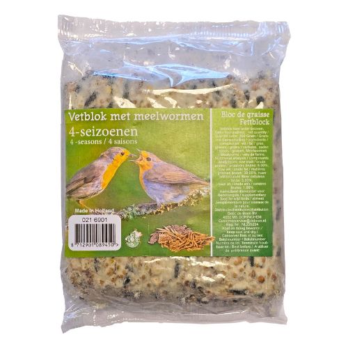 Met dit vetblok met meelwormen voor tuinvogels geef je vogels in je tuin een voedzame en energierijke traktatie. Vetblokken zijn een populaire vorm van vogelvoer en worden door veel soorten tuinvogels graag gegeten. Dankzij de combinatie van vetten en eiwitrijke meelwormen biedt dit vetblok een krachtige energiebron voor vogels.