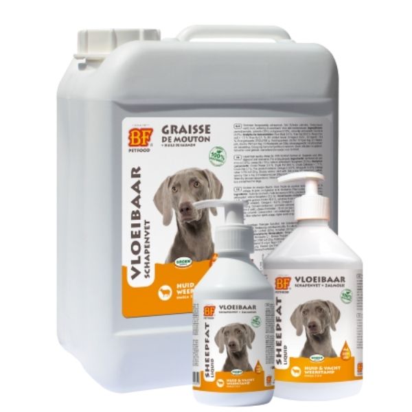BIOFOOD vloeibaar schapenvet bevat een combinatie van schapenvet, zalmolie (omega 3 en 6) en zonnebloemolie. De kenmerken zijn: rijk aan omega vetzuren 3, 6 en 9, met enkelvoudig onverzadigde (omega 9) en meervoudig onverzadigde vetzuren (linolzuur en omega 3 en 6), verbetert voedselopname en vertering, besparing dagelijkse voedingskosten, gezond voor hart en bloedvaten, betere ontwikkeling van de organen, ideaal voor vacht en huid. De vloeibare smaakmaker en de oplossing bij vele huid- en vacht irritaties bij honden. Voor alle hondenrassen.