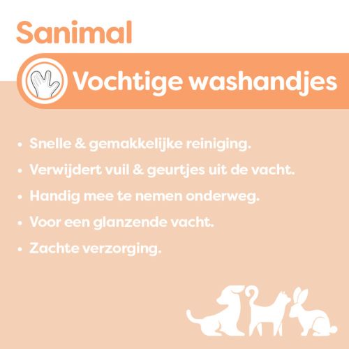Sanimal Vochtige Washandjes bieden een snelle en eenvoudige manier om jouw huisdier op te frissen, zonder een volledige wasbeurt. De handige vochtige washandjes verwijderen vuil en ongewenste geurtjes uit de vacht en laten een frisse kokosgeur achter. Dankzij de hydraterende ingrediënten, zoals aloë vera en kamille, verzorgen ze de huid en vacht en geven ze een mooie glans.