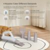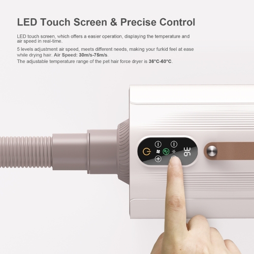 Het toestel wordt geleverd met vier slimme opzetstukken die elk hun eigen functie hebben. Het brede mondstuk is ideaal voor het snel drogen van grote oppervlakken zoals rug en flanken. Het smalle mondstuk geeft meer precisie en is perfect voor poten, oren en moeilijk bereikbare plekken. Het kam opzetstuk ontklit de vacht terwijl je droogt wat zorgt voor een gladdere en verzorgde afwerking. Voor honden met een gevoelige huid is de ronde diffuser ideaal dankzij de zachte en gelijkmatige luchtverdeling. De waterblazer is eenvoudig te bedienen met een modern touchpad waardoor je moeiteloos wisselt tussen standen.