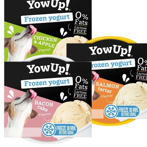YowUp! Frozen Yoghurt heeft een iets romigere formule dan de reguliere YowUp! yoghurt in knijpverpakkingen, zodat het na slechts 30 minuten bevriezen dezelfde textuur heeft als roomijs. Beschikbaar in drie heerlijke smaken – bacon cake, zalmtartaar, en kip & appel – biedt deze yoghurt een smakelijke en verfrissende traktatie die je huisdier zeker zal waarderen.