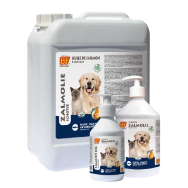 BF Petfood Zalmolie wordt koudgeperst* uit Pacificische zalm, is rijk aan meervoudig onverzadigde omega 3 en 6 vetzuren en bevat optimale EPA/DHA (8,5%/9,8%) waarden**.